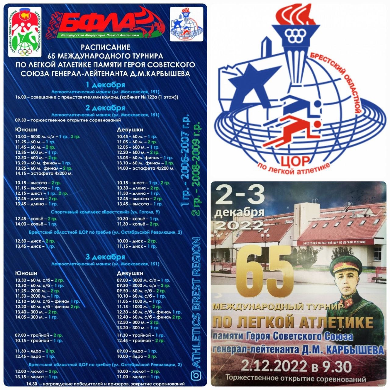 65 международный турнир по легкой атлетике памяти героя советского союза генерал-лейтенанта Д.М.Карбышева пройдет 1-3 декабря 2022 года. Главной ареной соревнований станет легкоатлетический манеж. Учащиеся УО "Брестское государственное областное училище олимпийского резерва" примут участие в метании копья, молота, диска.