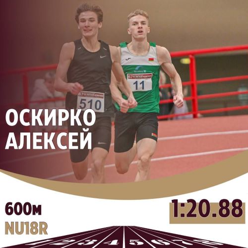 Спортсмен-учащийся Брестского государственного областного училища олимпийского резерва Алексей Оскирко установил новое высшее национальное достижение на дистанции 600 м для группы U18 - 1:20.88! Прежний рекорд страны был датирован 2008 годом и принадлежал Сергею Дудику - 1:21.85.