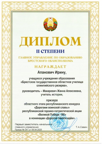 Поздравляем Апанович Ирину, учащуюся 8 «А» класса и Макаревич Жанну Алексеевну, учителя истории - призеров областного этапа республиканского конкурса «Дорогами воинской славы» республиканской героико-патриотической акции «Великой Победе – 80!» в номинация «Дорогой памяти идём» (Подробнее)