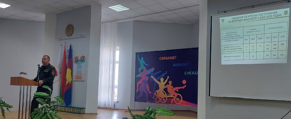 В рамках профориентационной работы, начальник общевойсковой кафедры военного факультета УО «Гродненский государственный университет имени Янки Купалы», полковник Андрей Андреевич Семенов, провел презентацию военного факультета. Родителям были представлены специальности, по которым ведется подготовка специалистов, а также подробно рассказано о преимуществах обучения на военном факультете ГрГУ по сравнению с другими направлениями.