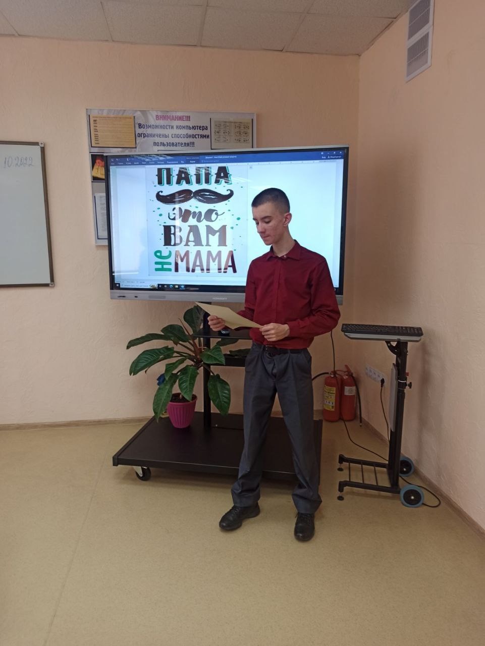 Были сделаны сообщения об истории и традициях этого праздника, дети рассказывали в этот день о своих отцах и дедушках. Учащиеся 1-2 курса просмотрели социальные ролики: «Папы», «Ваша семья», «Мама» с последующим их обсуждением. В 9 классах составили синквейны со словами папа, семья, мама. В 8 классах создавали поздравление от детей папам. В 10 классах ребята вспомнили пословицы и поговорки об отцах и в завершение написали пожелания отцам и оформили в виде бумажных корабликов. Учащиеся 11 классов раскрывали такую тему как «Я – будущий родитель», где определяли понятия «отцовство» и «материнство», делали сравнительный анализ этих понятий и провели интервью по вопросу «Я и моя будущая семья».