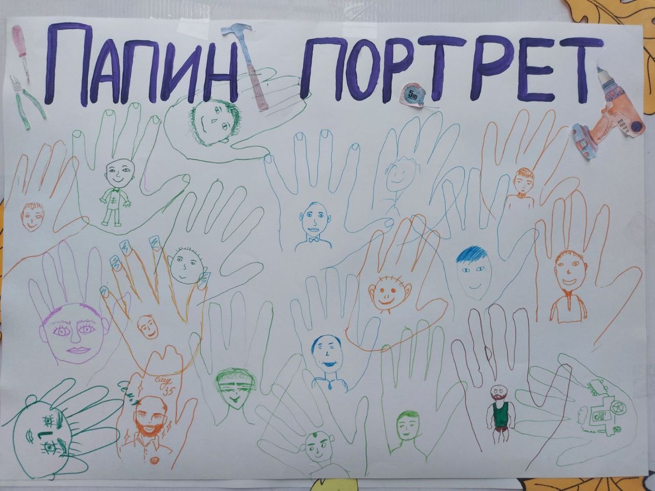 Ребятам предлагалось в контуре своей ладони изобразить папин портрет, сфотографироваться с портретами пап и отослать своим папам с предложением отыскать свой портрет.