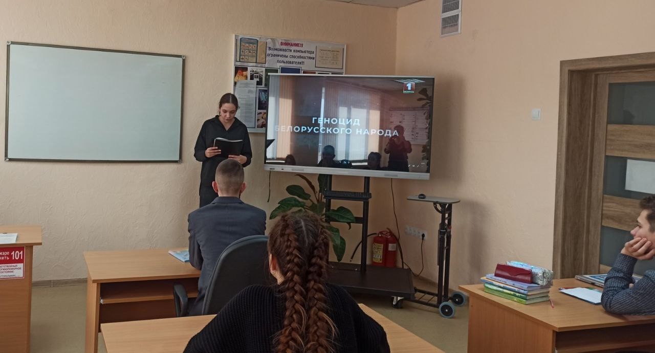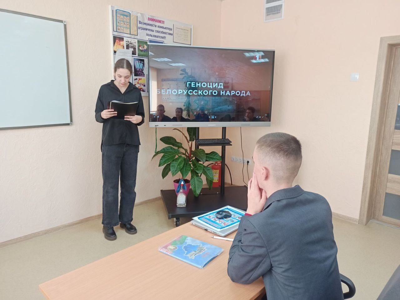 уроки, классные часы, информационные часы с использованием информационно-аналитических материалов и документов, представленных Генеральной прокуратурой Республики Беларусь. Оформлена стендовая печать «Никто не забыт, ничто не забыто». В общежитие организован просмотр художественного фильма «Помни имя, свое», проведено мероприятие «Трастенец наша память и боль» с просмотром документальной хроники «Трастенец» – мемориальный комплекс, «Трастенец» – история возникновения.