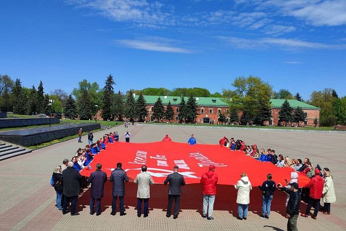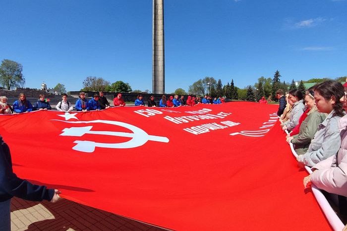 с зампредседателя горисполкома Виталием Щербой возложили цветы к Вечному огню, минутой молчания почтили память защитников Брестской крепости и всех тех, кто освобождал нашу Родину от немецко-фашистских захватчиков и, самое главное, развернули копию Знамени Победы площадью 200 квадратных метров.