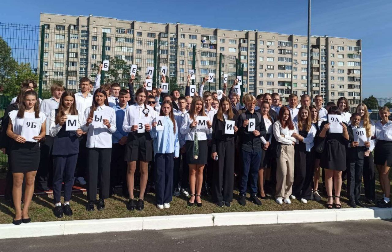 Дата публикации: 04 сентября 2023. Опубликовано в Новости 2023. Флешмоб "МЫ ЗА МИР" Ко Дню Знаний в рамках 1-го урока "Беларусь и Я - диалог мира и созидания" учащиеся 9-х классов организовали флешмоб "МЫ ЗА МИР. БЕЛАРУСЬ. СПОРТ" Назад Вперед