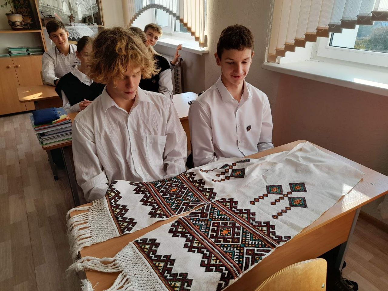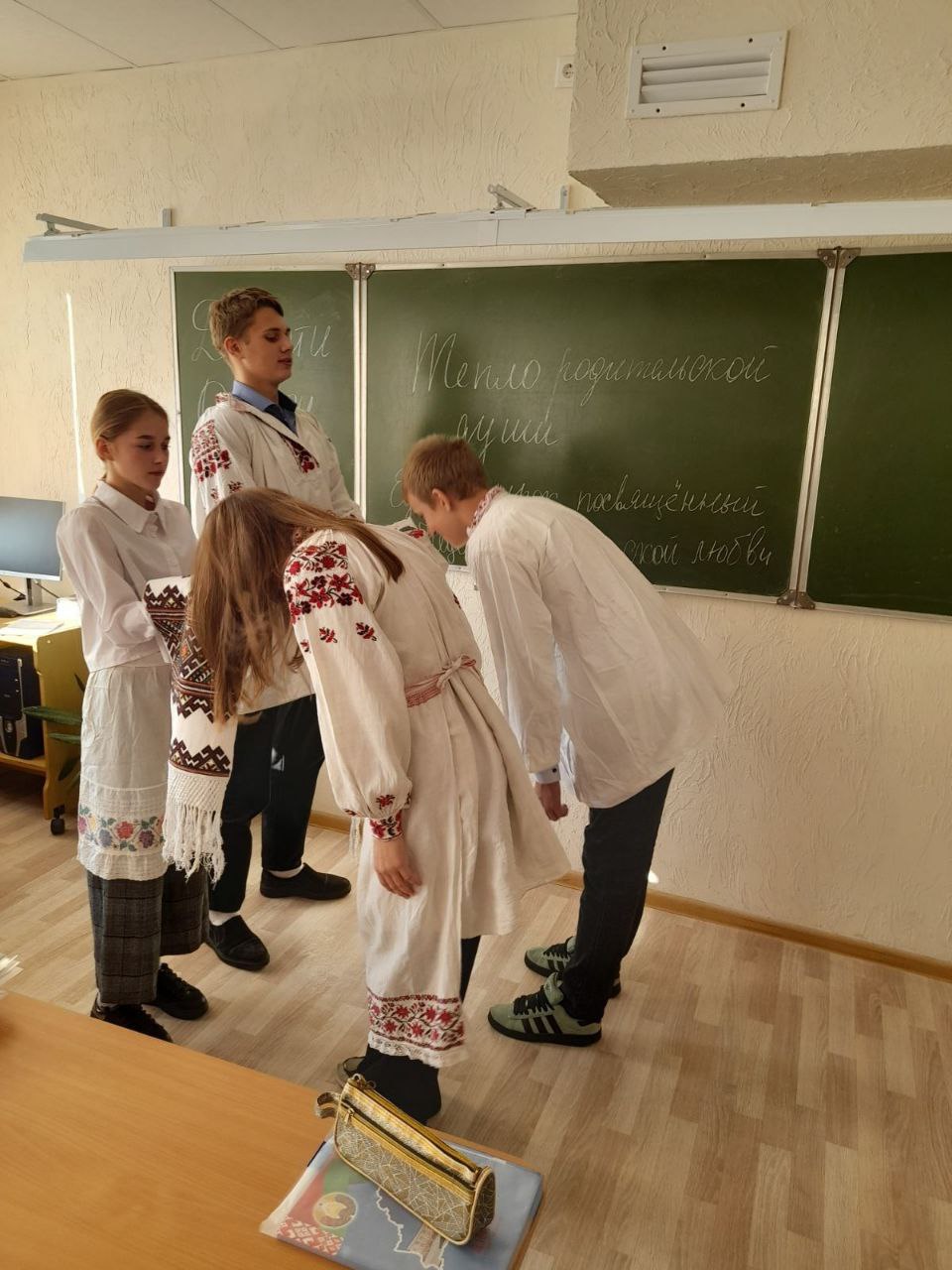 В 9-ых классах основой урока стала инсценировка "Мамин рушник". С рушником связано много обычаев: от рождения до ухода человека. Проведён мастер класс по глажке в ручную рубашек.