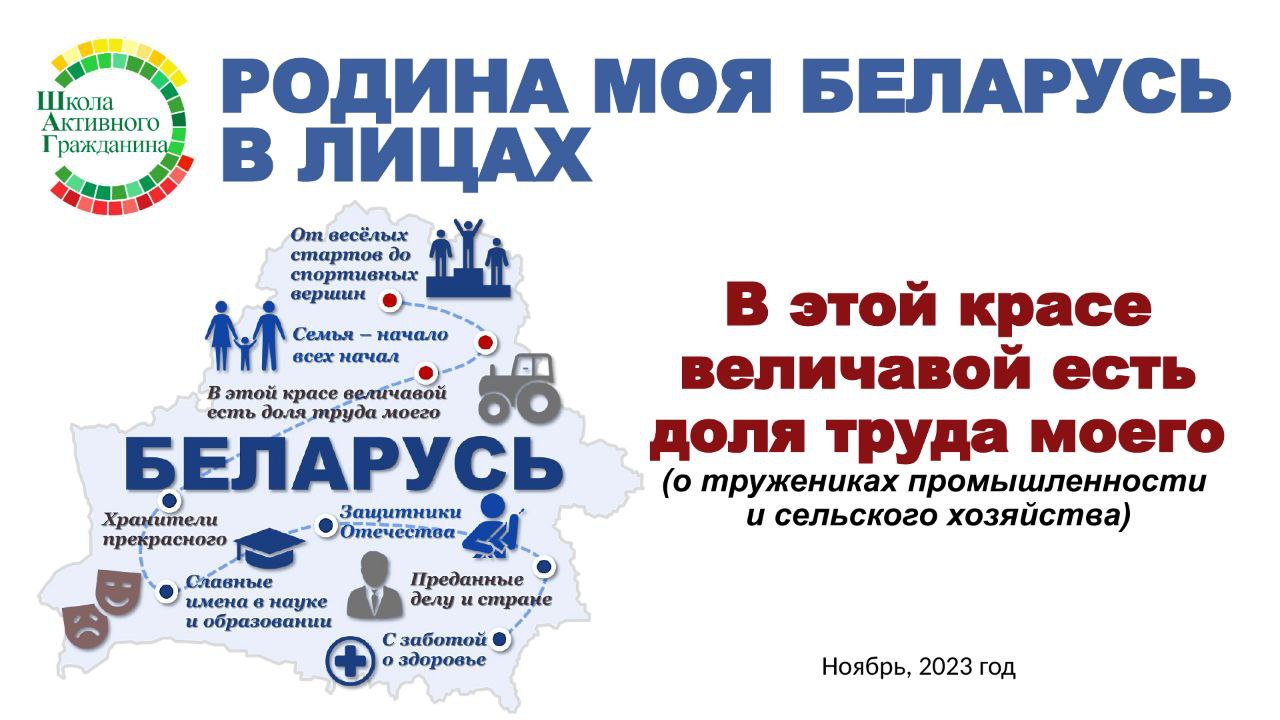 В рамках реализации проекта ШАГ в 9-ых классах прошел информационный час «Родина моя Беларусь в лицах. В этой красе величавой есть доля труда моего» (о тружениках промышленности и сельского хозяйства). Учащиеся рассказали о своих родных и близких, которые являются работниками сельского хозяйства, промышленных предприятий. Обсудили особенности профессий, их достоинства и перспективы.