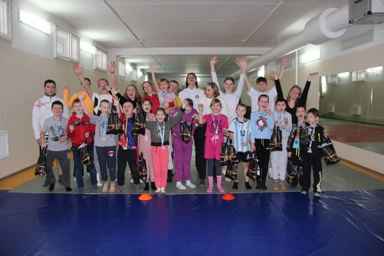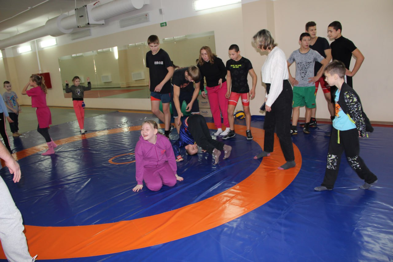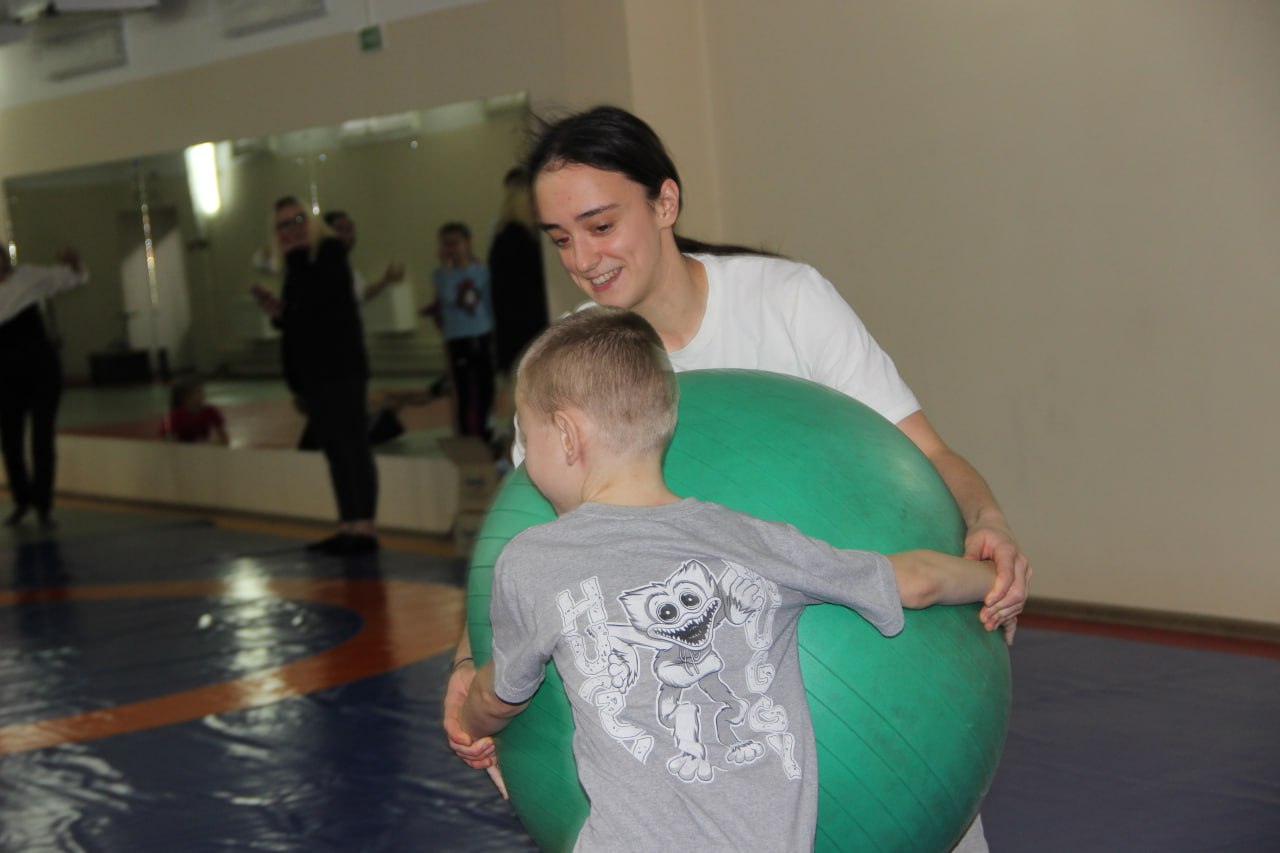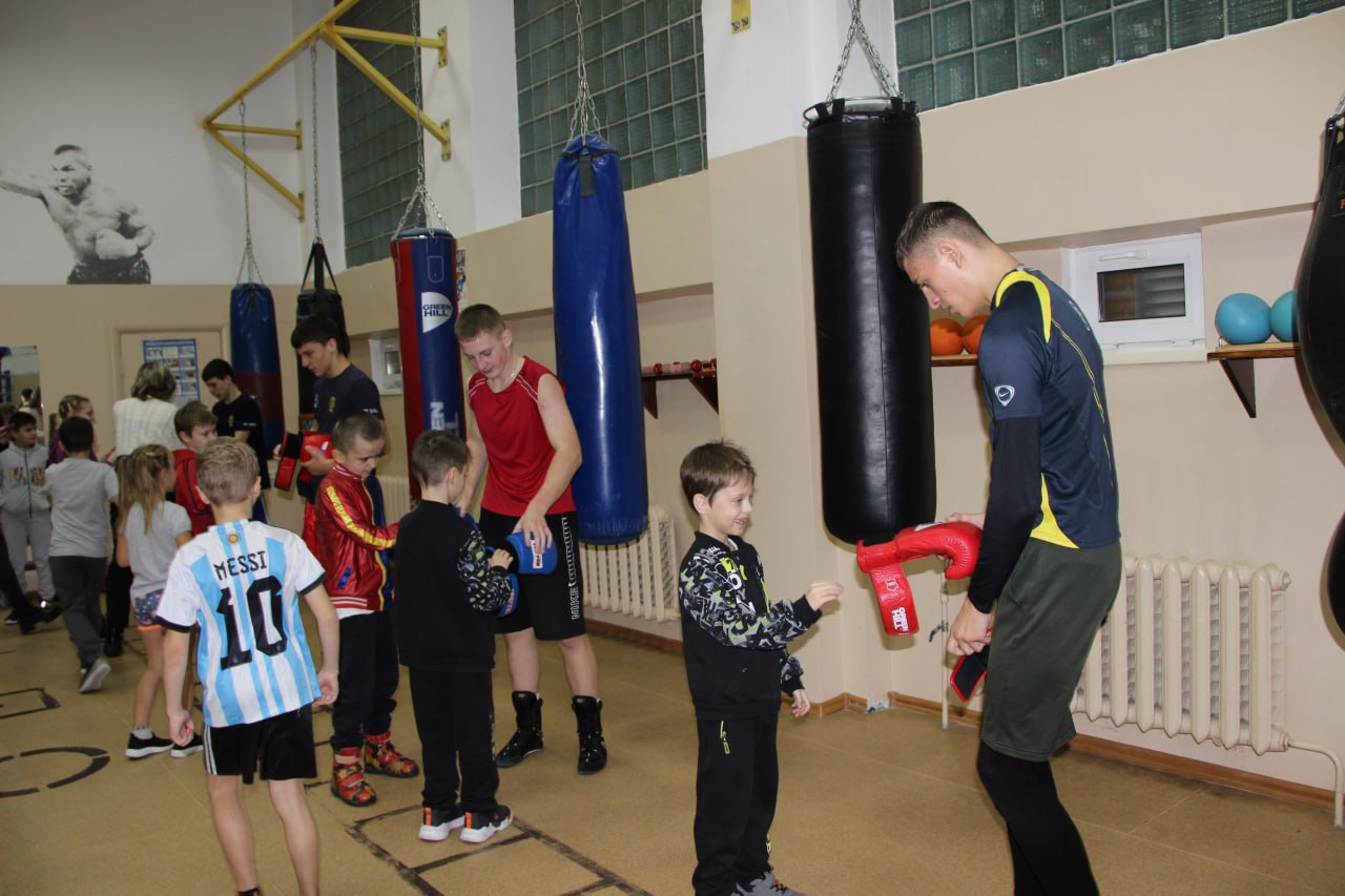 После выступлений дети смогли сами побоксировать на ринге в перчатках, ударить по «груше», покувыркаться на матах, а юные спортсмены им помогали надевать перчатки, поддерживать при выполнении кувырков.