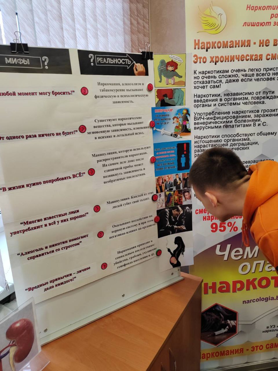 Учащиеся 8-х классов Брестского государственного областного училища олимпийского резерва 11 января посетили Центр наглядной профилактики Брестского областного центра гигиены, эпидемиологии и общественного здоровья, где встретились со специалистами центра, которые напомнили присутствующим о самых известных ПАВ: алкоголе, табаке, наркотиках. Выступления специалистов сопровождались наглядными примерами (осадок смолы в колбе, "курящая кукла", информационные стенды). Учащихся пригласили в "комнату страха", которая включает в себя макеты органов наркоманов, изображений и портфолио заболеваний, которые сопровождают наркомана всю жизнь.