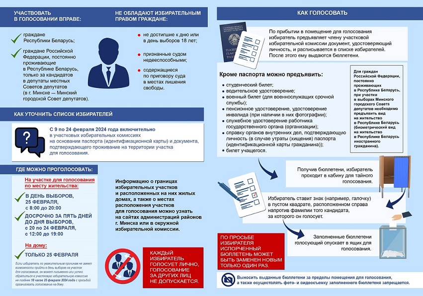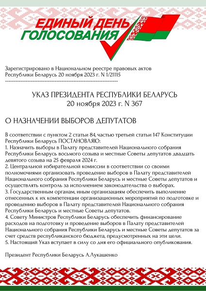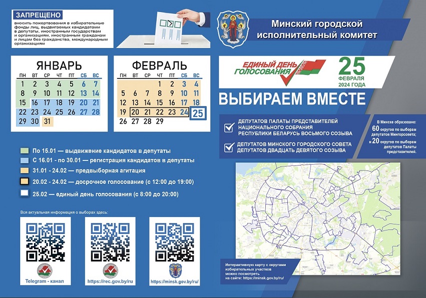Дата публикации: 31 января 2024. Опубликовано в Новости 2023. ЕДИНЫЙ ДЕНЬ ГОЛОСОВАНИЯ Сайт Центральной избирательной комиссии Республики Беларусь Вниманию избирателей! Назад Вперед