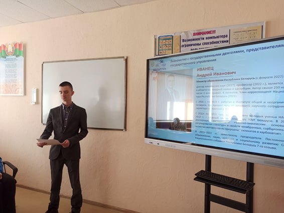Информационные часы в рамках информационно-образовательного проекта "ШАГ" по теме "Родина моя Беларусь в лицах. Преданные делу и стране" (о государственных деятелях, представителях органов государственного управления) прошли 21 марта во всех классах Брестского государственного областного училища олимпийского резерва.