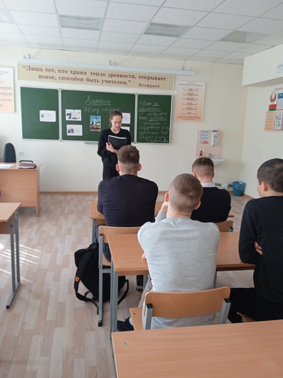 Цель урока была направлена на углубление знаний учащихся об историческом прошлом белорусского народа, трагических событиях в Хатыни, фактах геноцида белорусского народа в годы Великой Отечественной войны. Учащиеся вспоминали не только трагические события в Хатыни, но и д. Борки Малоритского района, которую гитлеровцы сожгли, судьбу детей детского дома в Домачево Брестского района.....