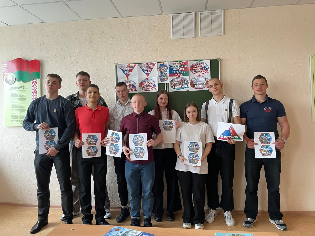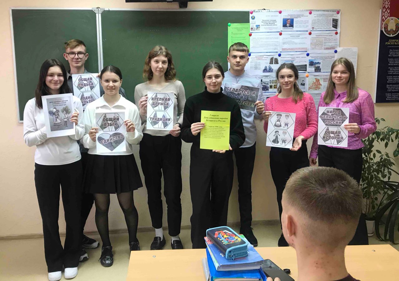 В рамках урока ребята посмотрели видеофильм «Беларусь и Россия - крепкие союзники!», приняли участие в обсуждении молодёжной политики и молодёжных программ Союзного государства, в беседе «Союзное государство – единое образовательное пространство для юных граждан», поучаствовали в блиц-опросе «Знаете ли вы…», в мини-игре «Дружба нас объединяет».
