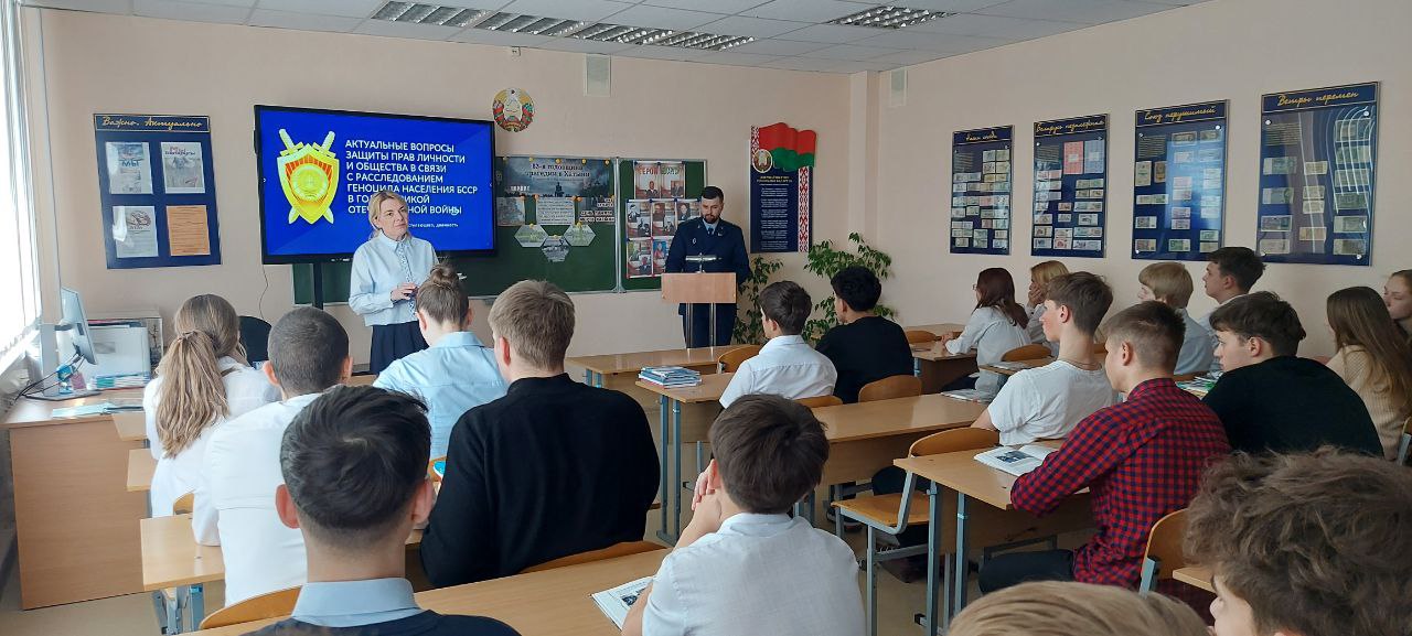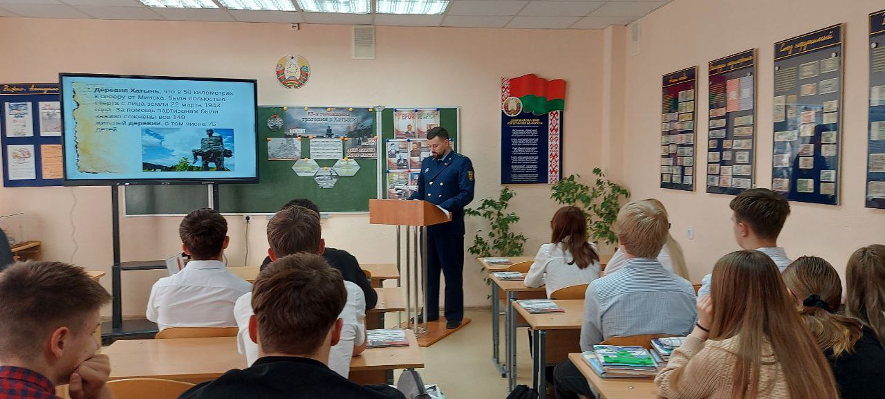 Учащиеся 9‑х классов узнали о ходе расследования уголовного дела о геноциде белорусского народа и об истории трагедии в деревне Хатынь.